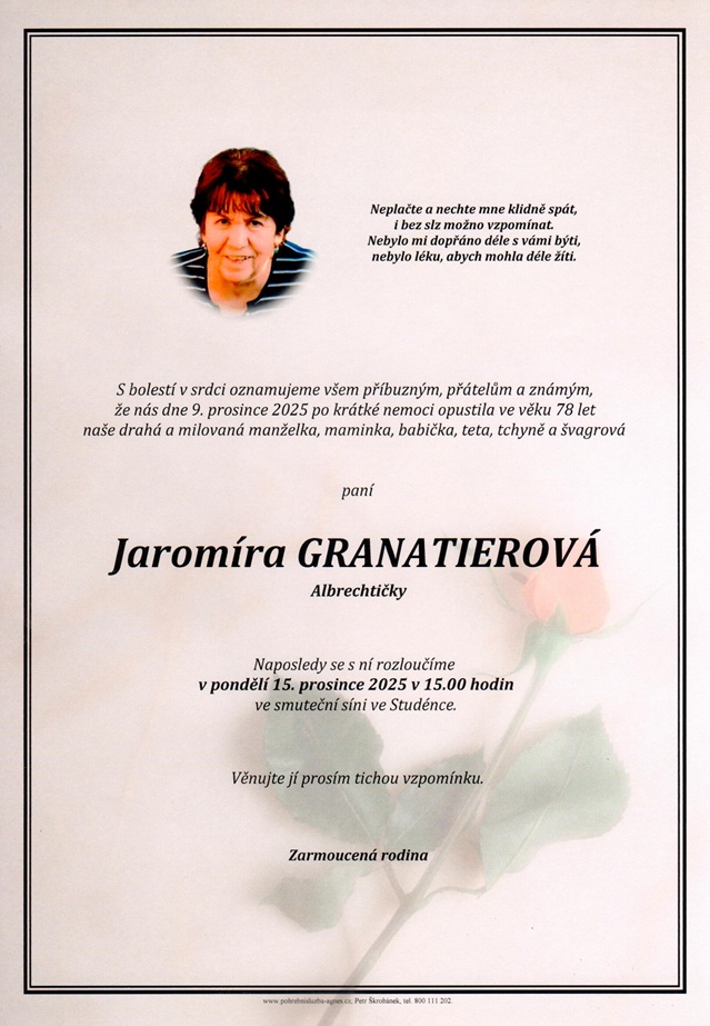 15.00 hodin Smuteční síň Studénka - Jaromíra Granatierová, 78 let