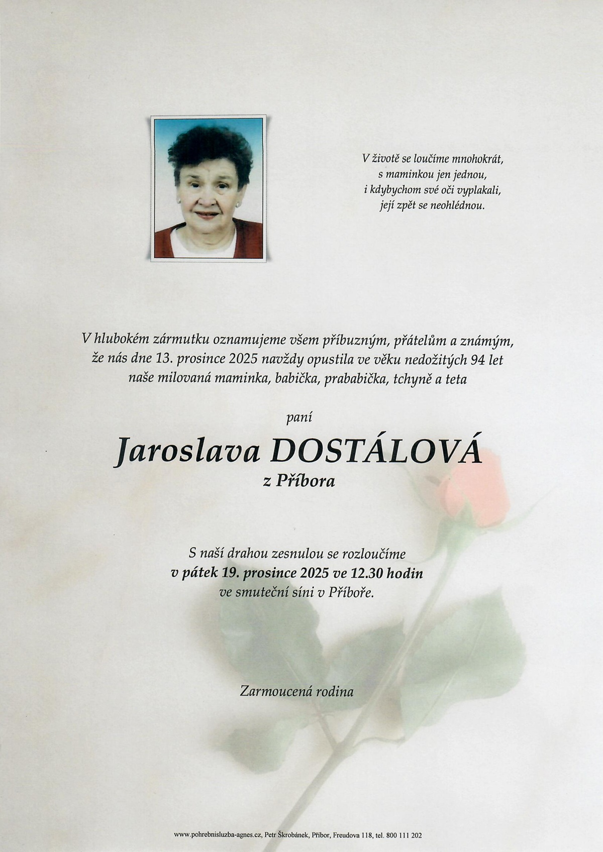 12.30 hodin Smuteční síň Příbor - Jaroslava Dostálová, 93 let