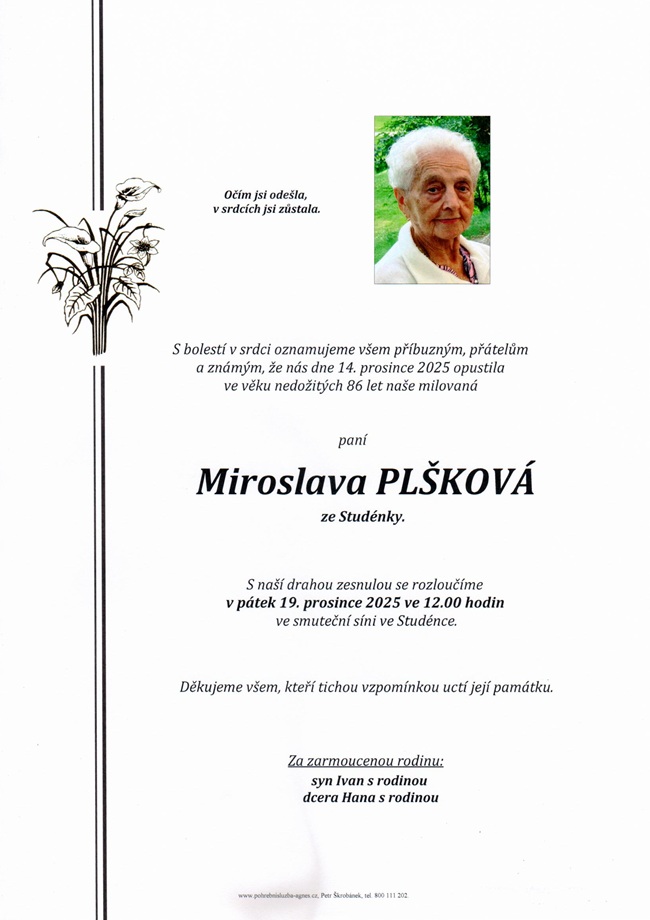 12.00 hodin Smuteční síň Studénka - Miroslava Plšková, 85 let