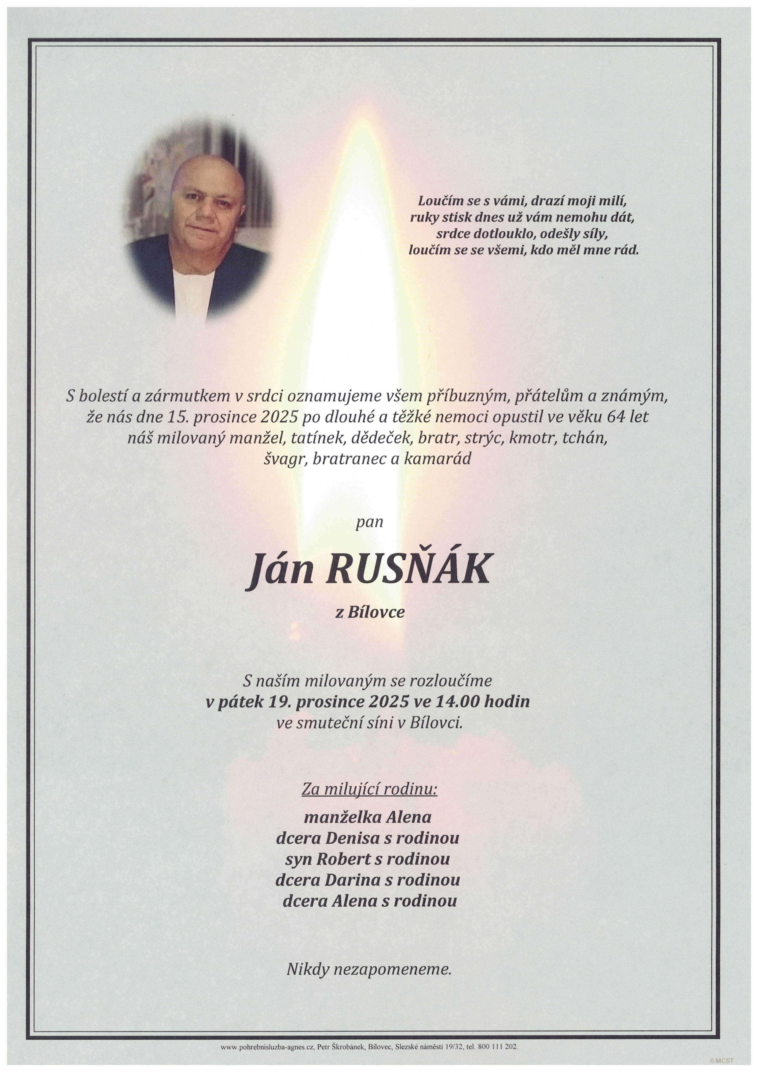 14.00 hodin Smuteční síň Bílovec - Ján Rusňák, 64 let