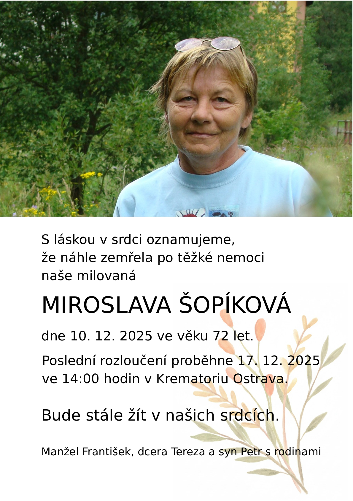 14.00 hodin Smuteční síň Krematorium Ostrava - Miroslava Šopíková, 72 let