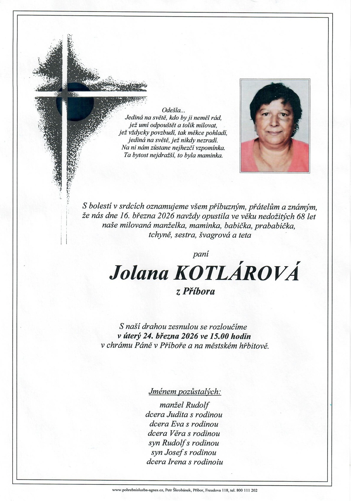 Aktuální rozloučení - pohřby | Pohřební služba St. Agnes, Bílovec, Opava, Hradec nad Moravicí, Studénka, Příbor, Fulnek