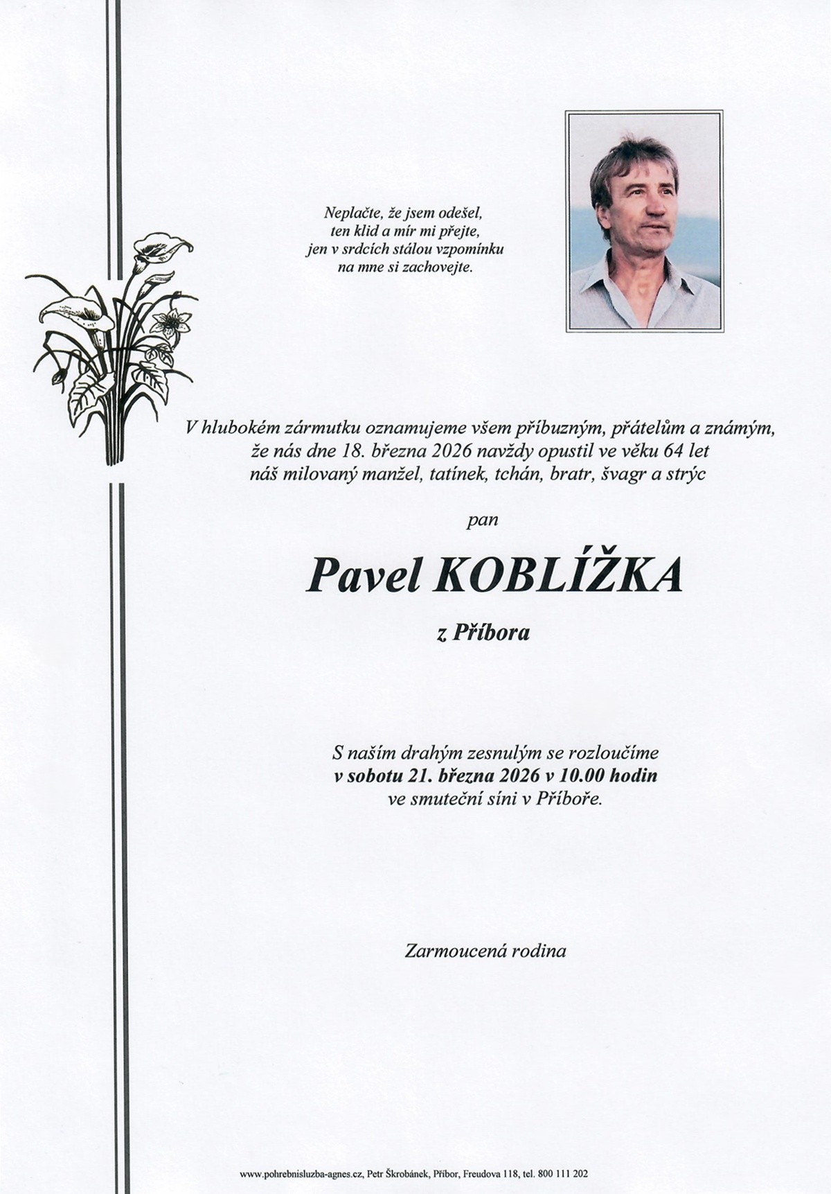 10.00 hodin Smuteční síň Příbor - Pavel Koblížka, 64 let