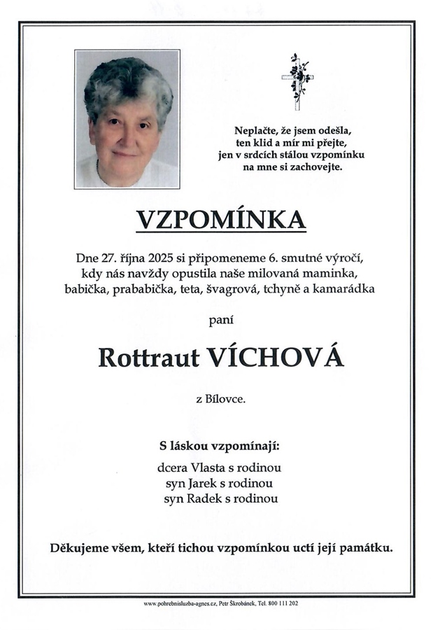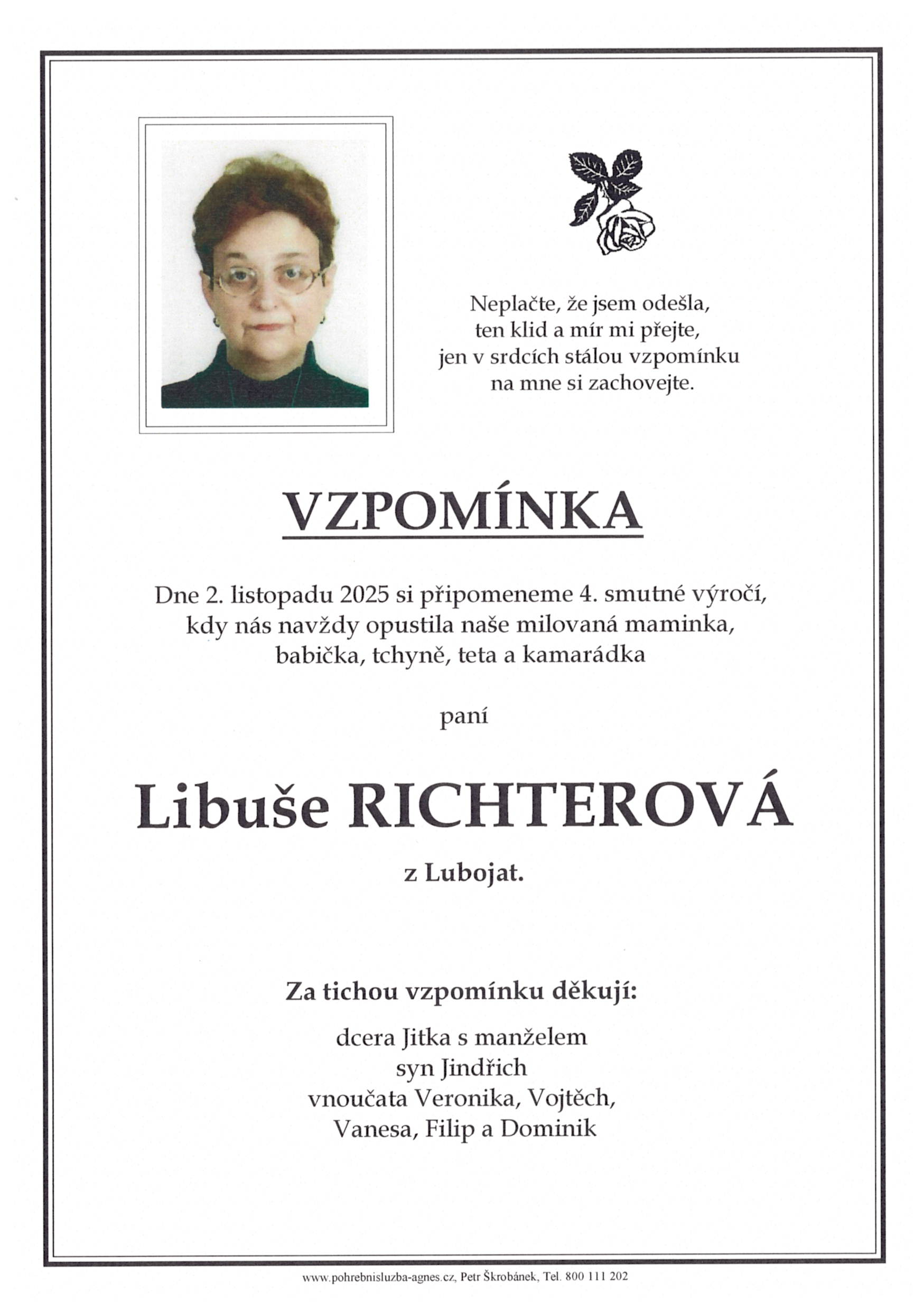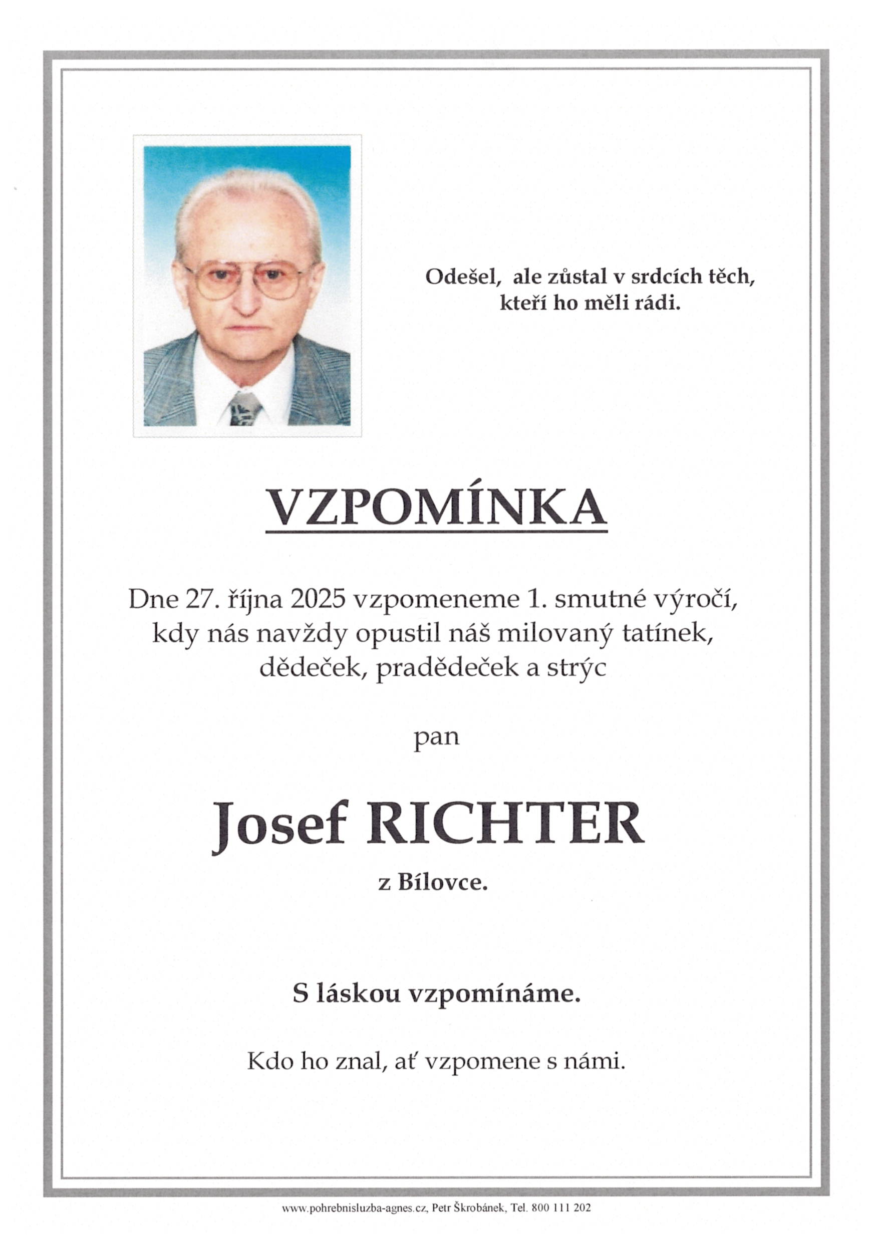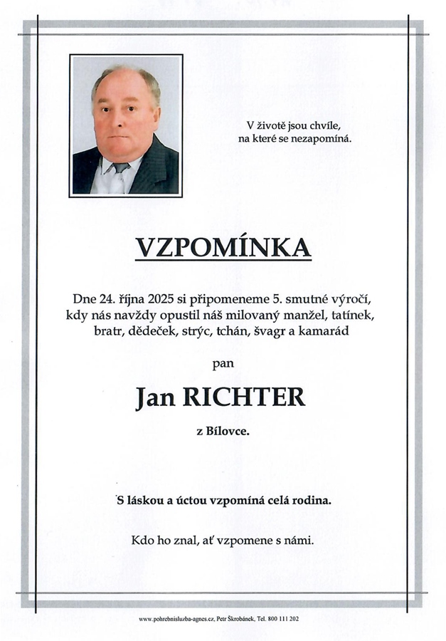 Vzpomínka Richter JanVzpomínka Richter JosefVzpomínka Šašková LudmilaVzpomínka Víchová RottraudVzpomínka Jurečka ErvínVzpomínka Plachká BohuslavaVzpomínka Kovárník MilanVzpomínka Čechanovičová MarieVzpomínka Richterová LibušeVzpomínka Mikušová Rozália